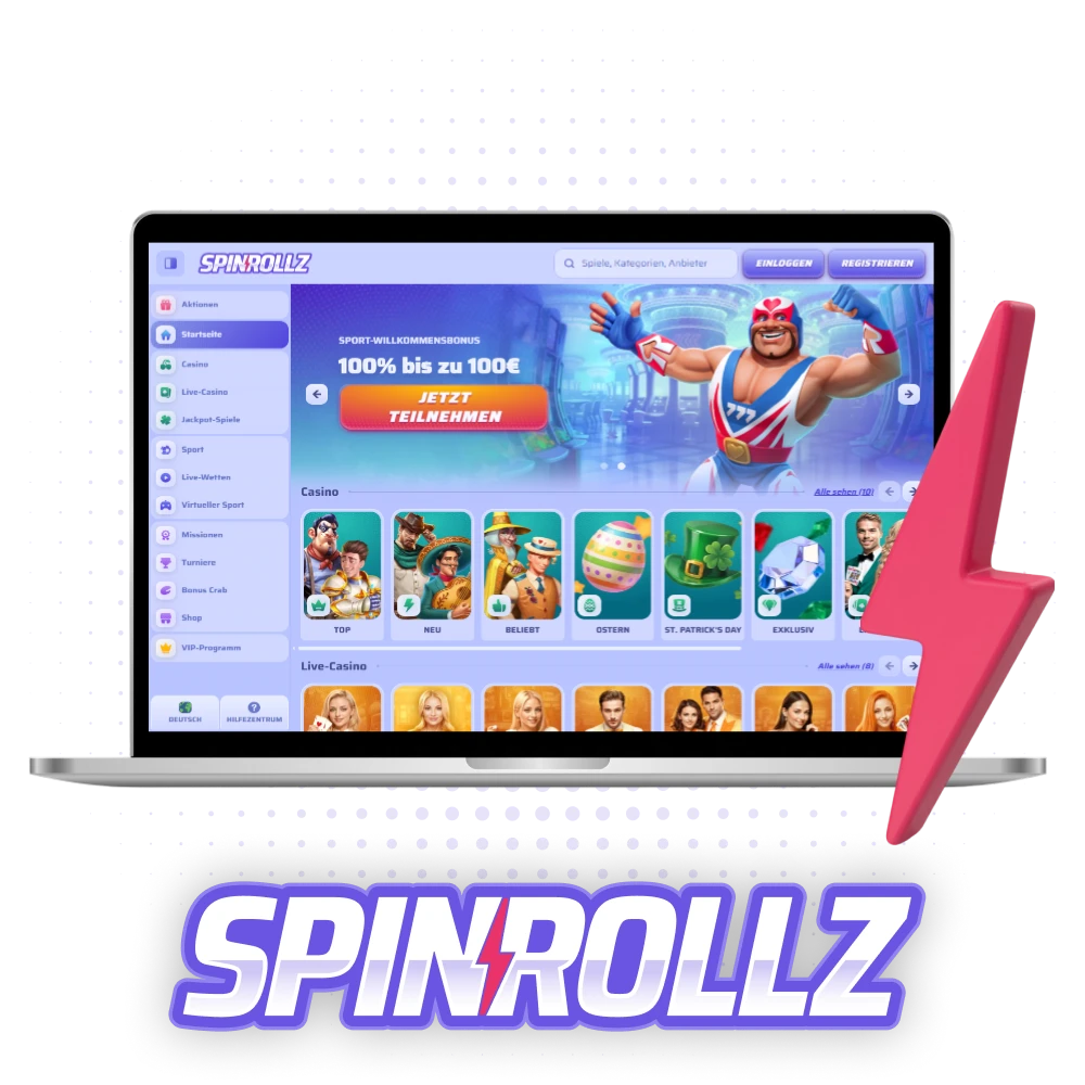 Seit 2021 bietet Spinrollz deutschen Spielern eine sichere Plattform mit offizieller Lizenz. Live-Sportwetten, Cybersport, Live Casino und über 3.000 Spielautomaten warten auf Sie. Zahlen Sie bequem per Bitcoin, Ethereum, Mastercard oder NeoSurf ein. Nutzen Sie die mobile App für iOS und Android. Sichern Sie sich jetzt 100% bis zu 500€ plus 200 Freispiele als Willkommensbonus. Ihr Entertainment beginnt hier – schnell, sicher und fair.